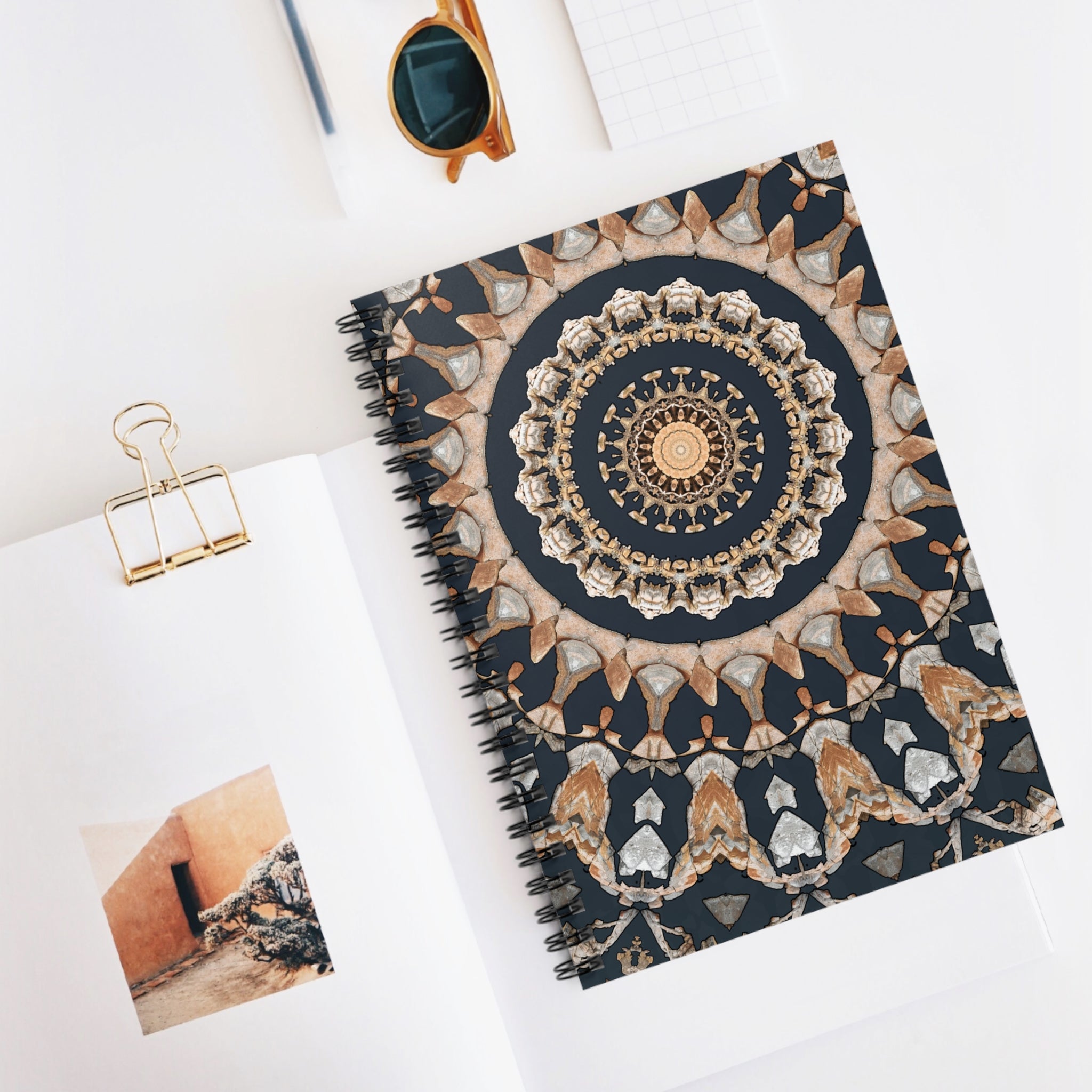 Capture your thoughts, sketches, and inspirations in a journal that reflects the deeper harmonies of nature. Featuring Earthlines’ kaleidoscopic mandala artwork—created from aerial photography of rock formations and landscapes—this 6x8 spiral notebook blends artistic beauty with everyday function. Durable 350 gsm cover, 118 ruled pages, and sturdy spiral binding make it perfect for journaling, note-taking, or creative writing.